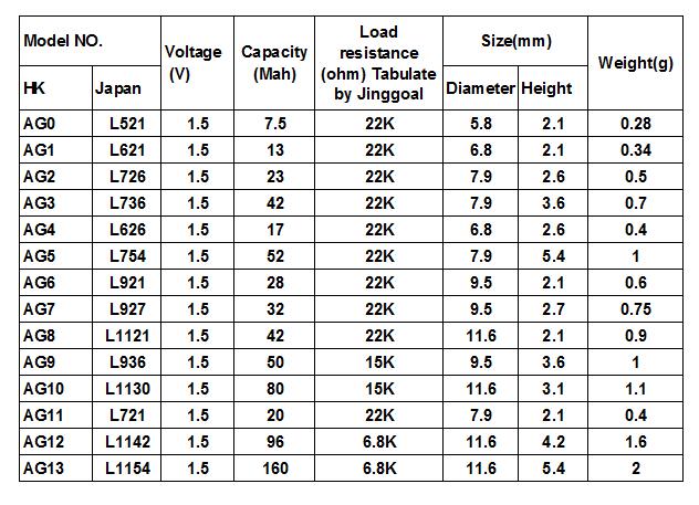 纽扣电池 AG0-AG1-AG2-AG3-AG4-AG5-AG6-AG7-AG8-AG9-AG10-AG11-AG12-AG13 的电池容量是多少?